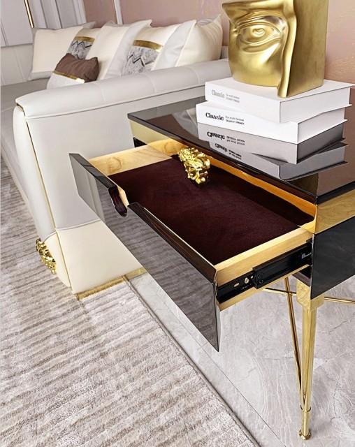 Medusa sidebord kombinerer moderne design med smart funksjon. Bruk det som nattbord ved sengen, ekstra bord i stuen, eller til dekorative formål – alltid med et sofistikert uttrykk i sort og gull.