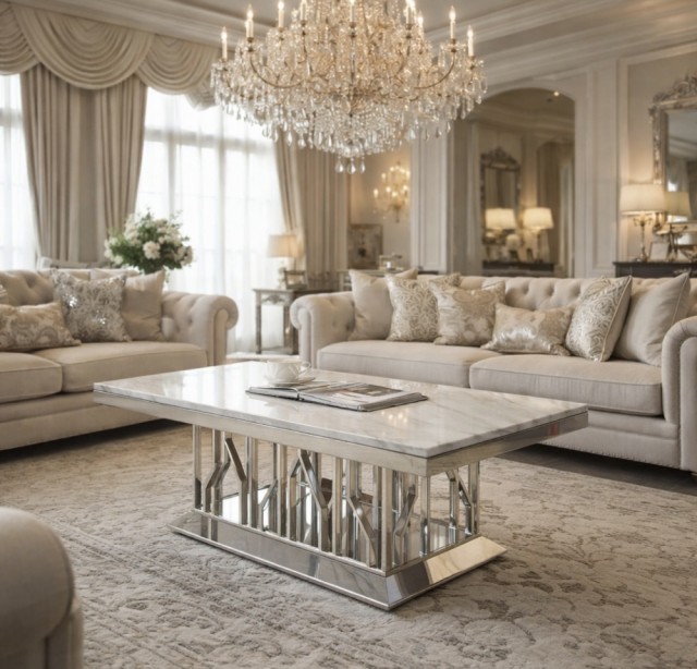 Moderne og elegant sofabord som vil tilføre rommet ekslusiv eleganse. Bordplaten er laget av en unik hvit stein plate og understellet i rustfritt stål. Sammen gir dette et utrolig flott og tidsriktig design som passer godt inn i de aller fleste miljøer.