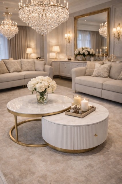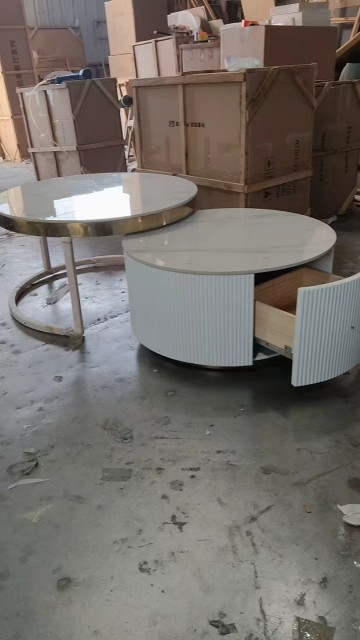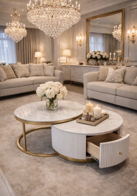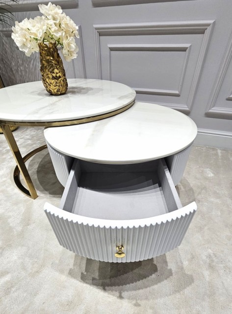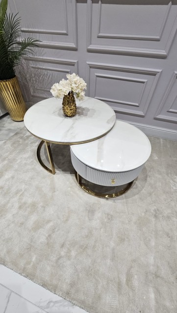 Oppgrader stuen din med dette elegante sofabordsettet, bestående av to bord som kan plasseres inni hverandre for optimal plassutnyttelse hvor det høyeste bordet har en elegant hvit steinplate med gull rustfrie stålben, mens det laveste bordet er laget av solid massivt treverk med en matchende steinplate som har en romslig skuff med et nylig gullfarget rustfritt stål håndtak for praktisk oppbevaring.