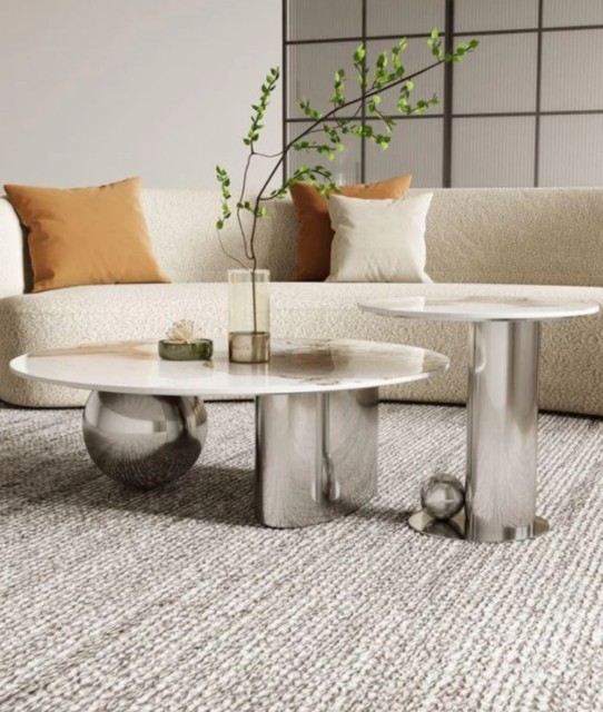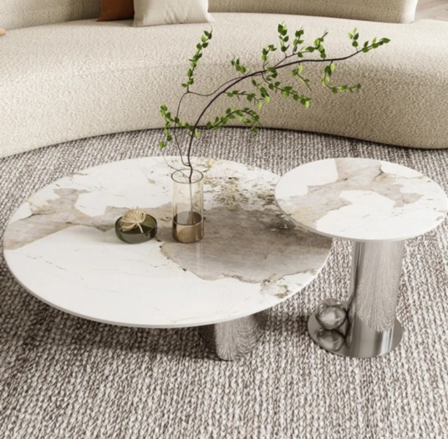 Laget av høykvalitets svart rustfritt stål og hvit steinplate. Det fleksible designet gir deg muligheten til å bruke det som et sett med to bord eller separat som sofabord og sidebord .