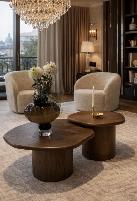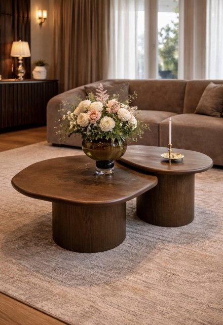 De myke, avrundede linjene gir en rolig og harmonisk følelse, samtidig som det unike designet gjør bordet til et naturlig blikkfang. Den varme tretonen tilfører dybde og karakter, og passer sømløst inn i både moderne og klassiske interiør.