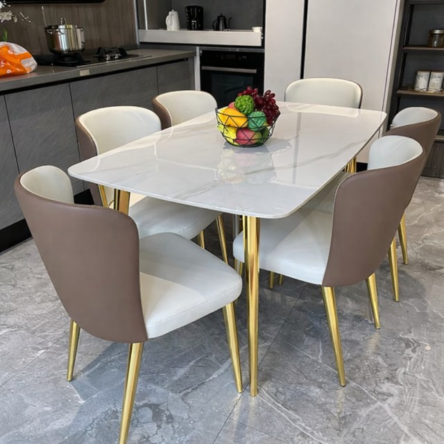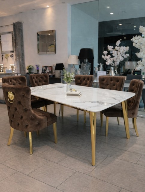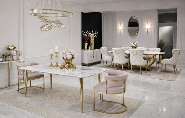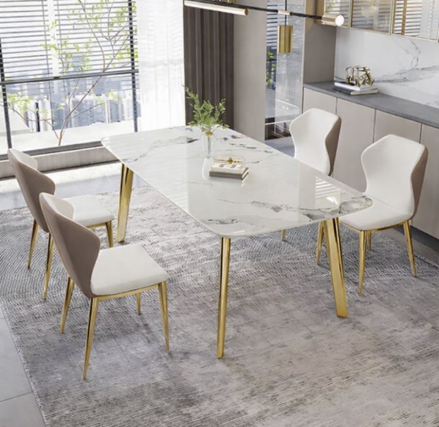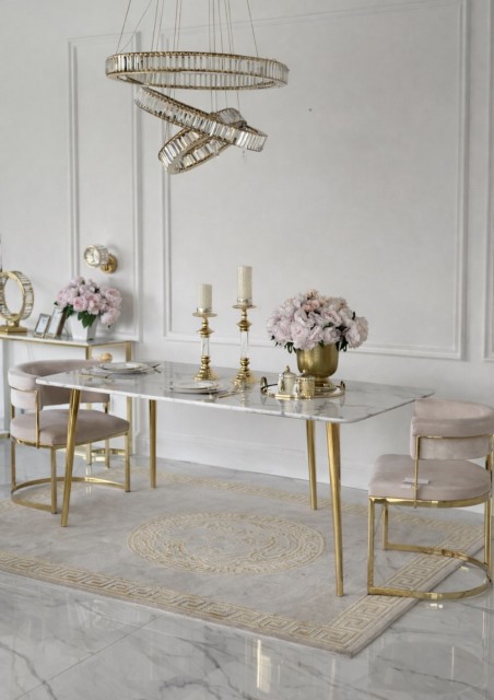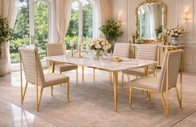 Den eksklusive bordplaten i ekte stein gir et luksuriøst preg med vakre naturlige detaljer, samtidig som overflaten er solid, slitesterk og laget for daglig bruk. De stilrene beina i rustfritt stål tilfører eleganse, stabilitet og en moderne finish som løfter helhetsinntrykket.