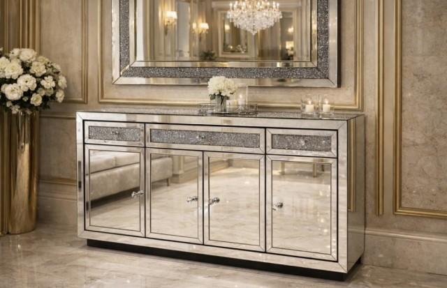 Vakker og unik skjenk med speilende overflater som skaper et reflekterende og levende møbel hvor enn den plasseres.