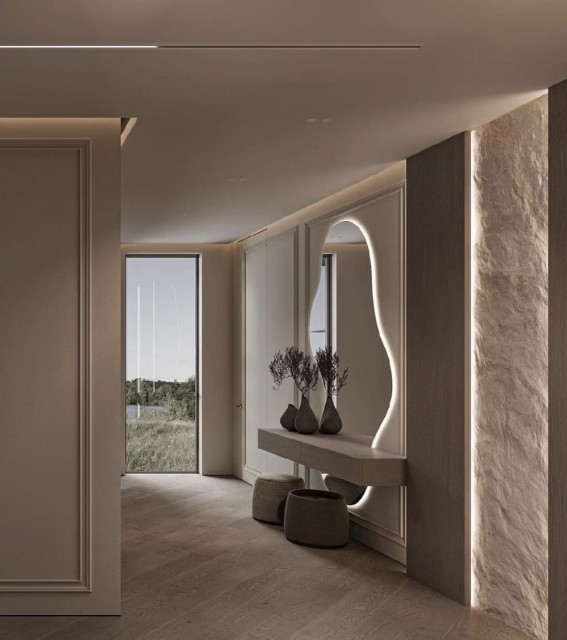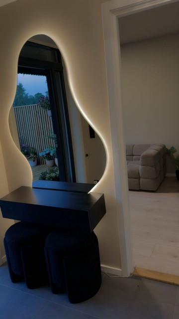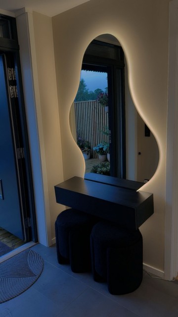 Dette speilet er et nydelig valg både som sminkebord og som et eksklusivt interiørelement i gangen, stuen eller soverommet. Med sitt skulpturelle design, stemningsfulle belysning og høye kvalitet tilfører det rommet en følelse av luksus og gjennomført eleganse, uansett hvor det plasseres.