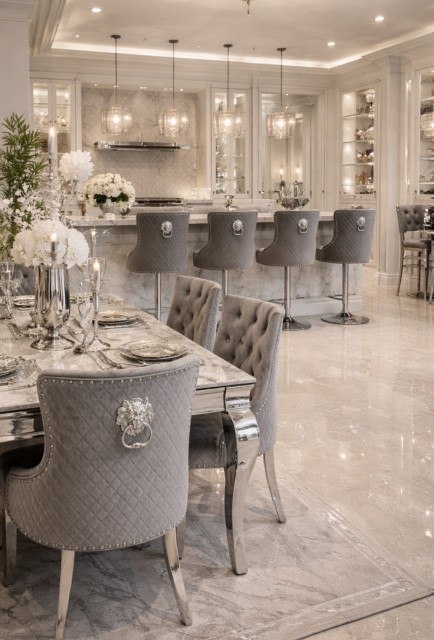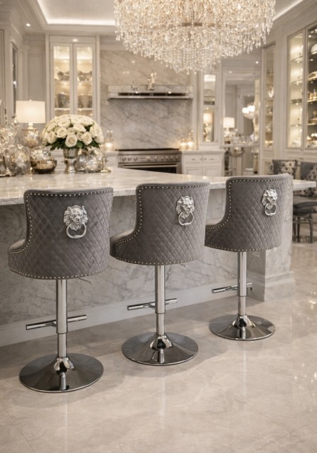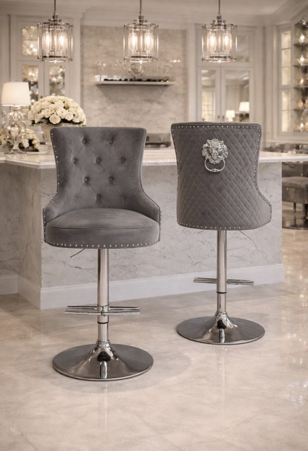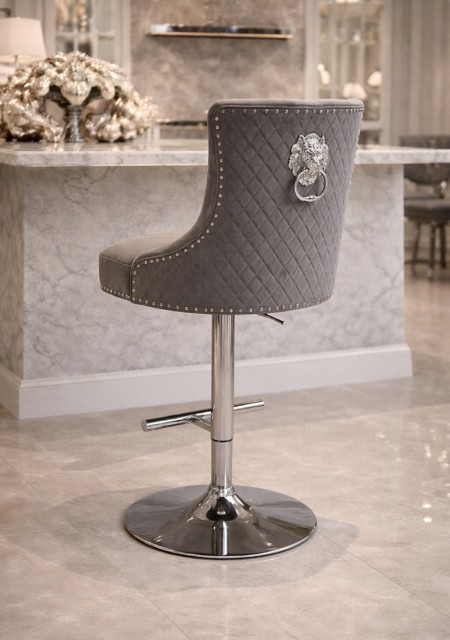 Materialet i setet er produsert av italiensk velour stoff og bena er laget av sølv rustfritt stål. Perfekt til kjøkkenøya eller ved baren.