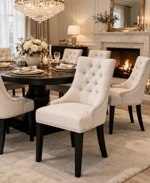 Oppgrader din spisestue med våre eksklusive spisestoler, laget av førsteklasses linen stoff og svart treverk. Disse stolene kombinerer eleganse og holdbarhet, noe som gjør dem til det perfekte tilskuddet til ethvert interiør, enten det er moderne eller klassisk. Med sitt tidløse design og ergonomiske komfort, er de ideelle for lange middager eller koselige sammenkomster. Bestill nå og opplev den perfekte balansen mellom stil og funksjonalitet!