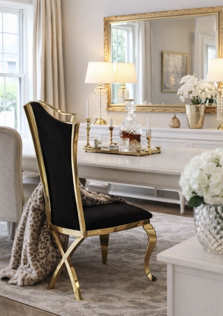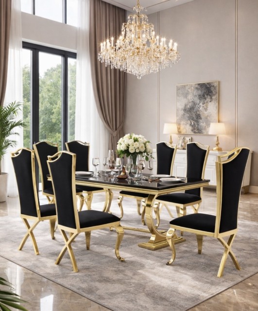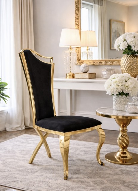 Opplev luksusen av italiensk velour og gull rustfritt stål med vår elegante stol. Ikke bare er denne stolen utrolig behagelig å sitte i, men den er også en vakker tilføyelse til ethvert hjem. Det høykvalitets materialene gjør stolen lett å rengjøre og den vil vare i mange år fremover. Med sin tidløse eleganse kan vår stol passe inn i alle slags interiørstiler, og gi øyeblikkelig stil til ethvert rom. Gi deg selv noe ekstra med vår elegante stol og opplev komfort og stil i ett og samme produkt.