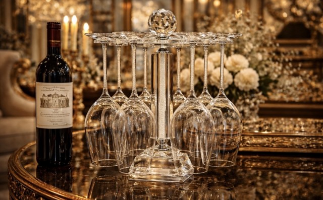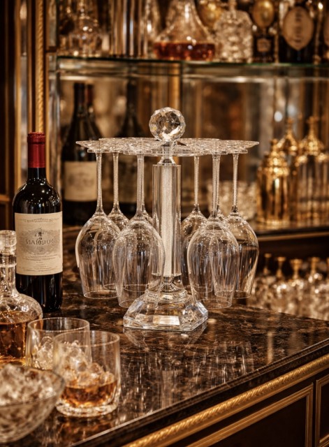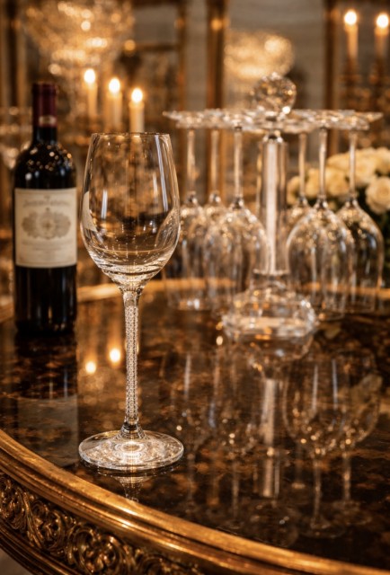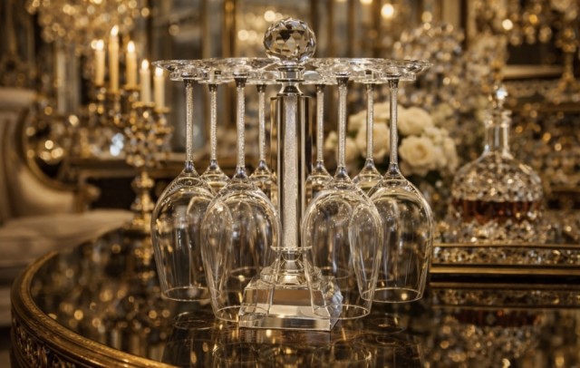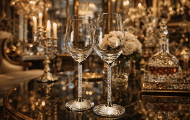 Stetten på glasset er fylt med nydelige krystaller med sølvkant ned mot foten og gir et eksklusivt preg hvor krystallene glitrer.