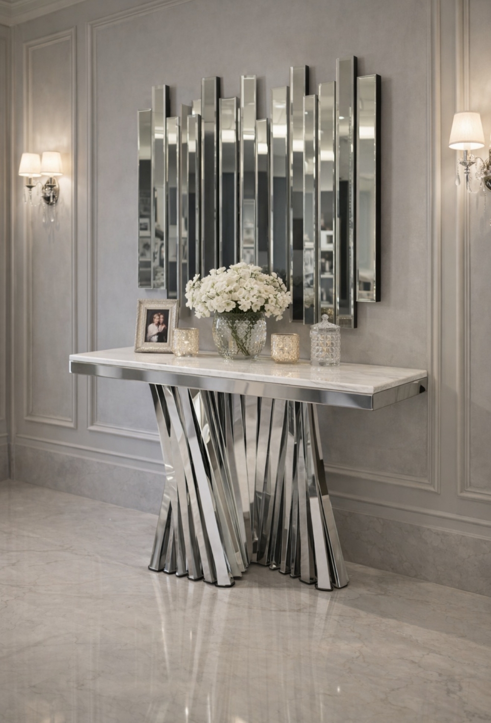 Beverly Hills konsollbord - Hvit stein& Sølv rustfritt stål understell TilbudNOK7 395,00 Førpris:NOK8 700,00 -15% inkl. mva. Kjøp