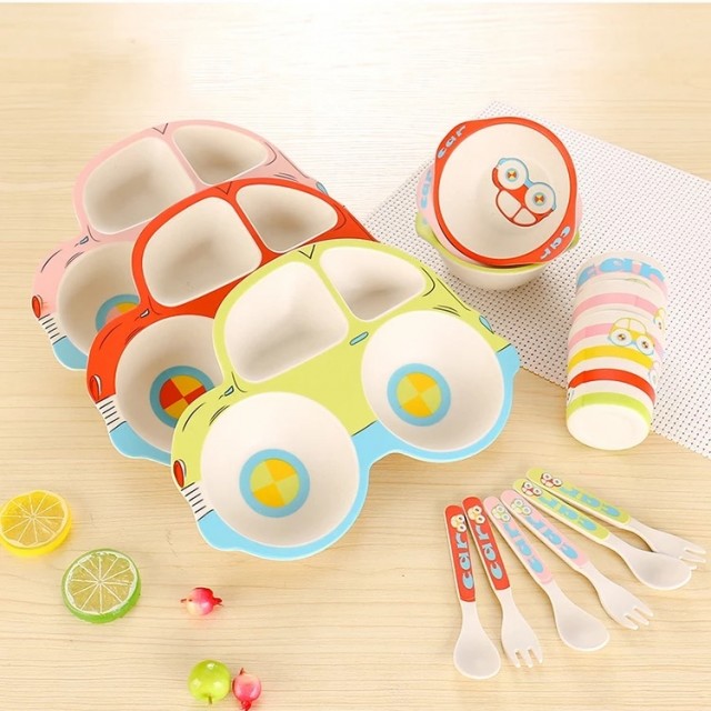 Et søtt og miljøvennlig servise sett for barn som er perfekt for alle måltider. Hele sette er laget av bambusfiber. Bambusfiber er fornybar og snill både mot planeten og barn. Settet knuses ikke og veier lite.