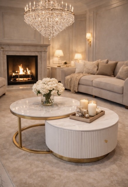 Oppgrader stuen din med dette elegante sofabordsettet, bestående av to bord som kan plasseres inni hverandre for optimal plassutnyttelse hvor det høyeste bordet har en elegant hvit steinplate med gull rustfrie stålben, mens det laveste bordet er laget av solid massivt treverk med en matchende steinplate som har en romslig skuff med et nylig gullfarget rustfritt stål håndtak for praktisk oppbevaring.