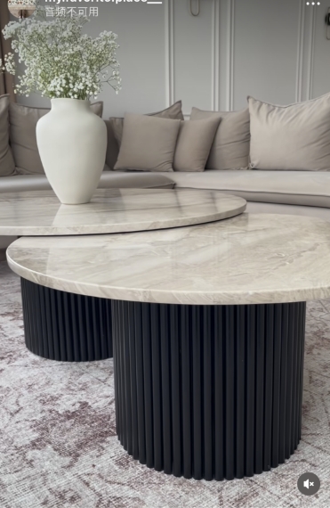 Oppgrader stuen med et elegant sett med to sofabord i ulik høyde. Bordene kan brukes sammen i et stilig lag-på-lag design, eller plasseres hver for seg. Begge bordene har den eksklusive kombinasjonen av lyse steinplater og de karakteristiske sorte, riflede treunderstellene som går igjen i vår kolleksjon.