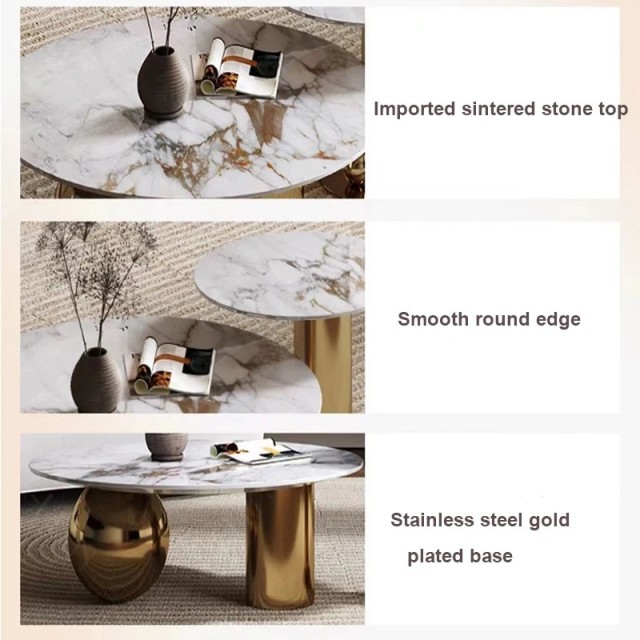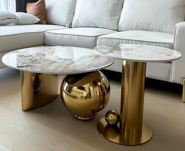 Laget av høykvalitets svart rustfritt stål og hvit steinplate. Det fleksible designet gir deg muligheten til å bruke det som et sett med to bord eller separat som sofabord og sidebord .