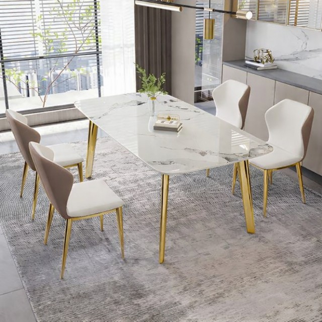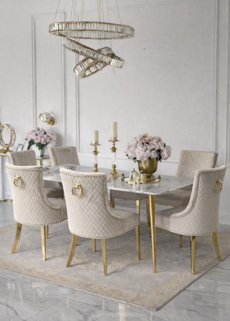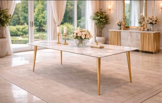 Den eksklusive bordplaten i ekte stein gir et luksuriøst preg med vakre naturlige detaljer, samtidig som overflaten er solid, slitesterk og laget for daglig bruk. De stilrene beina i rustfritt stål tilfører eleganse, stabilitet og en moderne finish som løfter helhetsinntrykket.