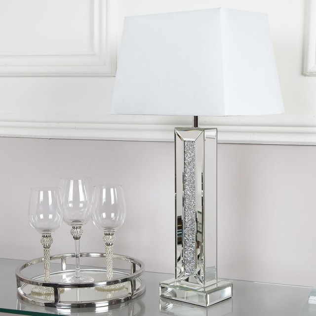 Noen ganger er en ny lampe alt som skal til for å skaper en hyggelig stemning. Denne elegante bordlampen er lagd av av speilglass som lyser opp rommet med en helt vanlig lyspære.