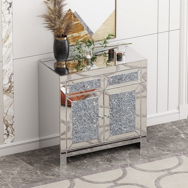 Eksklusiv og dekorativ kommode i speil m krystall/diamanter. Kommoden har 2 romslig og praktisk skuffer og 2 dører blir som et smykke i rommet.