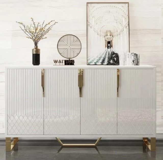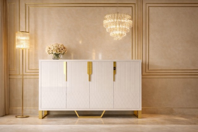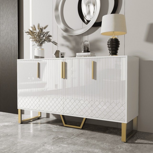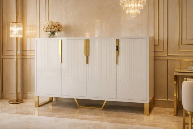 Miami er en klassisk og stilrent sjenk i hvit eik/MDF med gull rustfritt stål understell&håntak av meget god kvalitet.