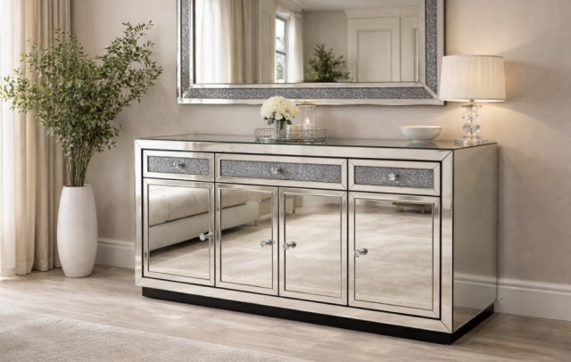 Denne glamorøse skjenken er et ekte blikkfang! Med glitrende detaljer og rene speilflater kombinerer den luksus med praktisk oppbevaring. Skuffene gir plass til det du vil skjule, mens designet tilfører rommet en hotellfølelse. En perfekt match for deg som elsker eleganse og kvalitet.
