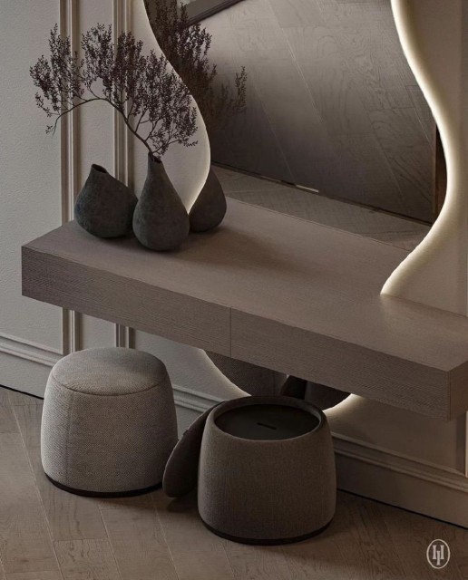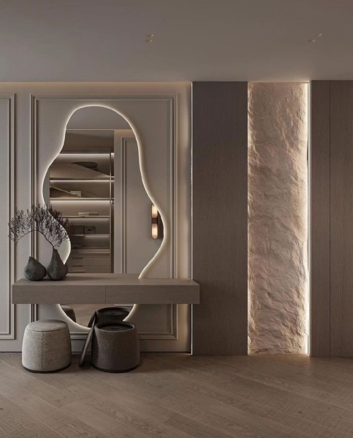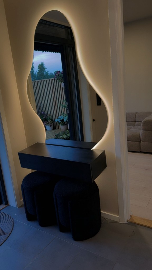 Dette speilet er et nydelig valg både som sminkebord og som et eksklusivt interiørelement i gangen, stuen eller soverommet. Med sitt skulpturelle design, stemningsfulle belysning og høye kvalitet tilfører det rommet en følelse av luksus og gjennomført eleganse, uansett hvor det plasseres.