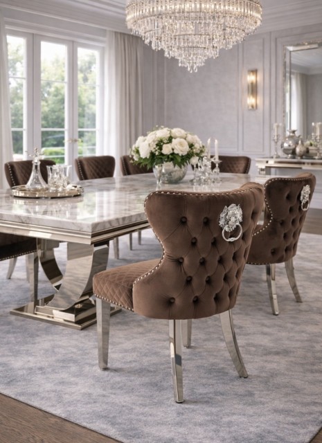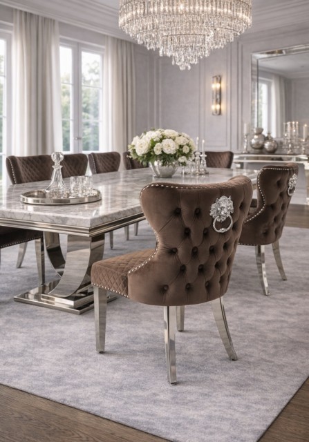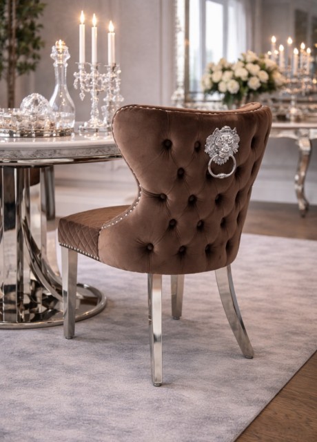 Den er tilgjengelig i et bredt utvalg av rike fløyelsfarger med ben i sølv rustfritt stål.