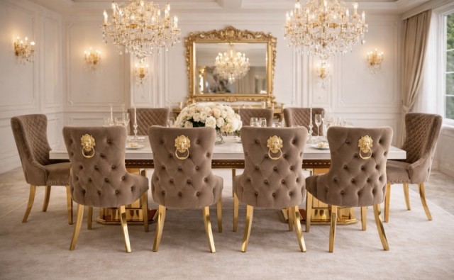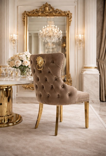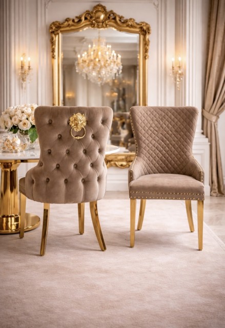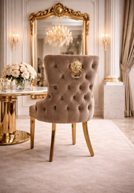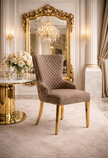 Den er tilgjengelig i et bredt utvalg av rike fløyelsfarger med ben i gull rustfritt stål.