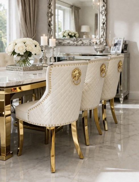Oppgrader spisestuen med denne eksklusive stolen som kombinerer elegant design, produsert av meget høye materialer. Den er kledd i mykt syntetisk skinn i en sofistikert beige nyanse, som gir et luksuriøst preg til rommet. Understellet, laget av rustfritt stål i gullfinish, gir et moderne og stilfullt uttrykk som er både slitesterkt og vakkert. Denne stolen tilfører et sofistikert og innbydende utseende til enhver spisegruppe, og er et perfekt valg for deg som ønsker å skape en raffinert og hyggelig atmosfære i hjemmet ditt. Utrolig lett å rengjøre.